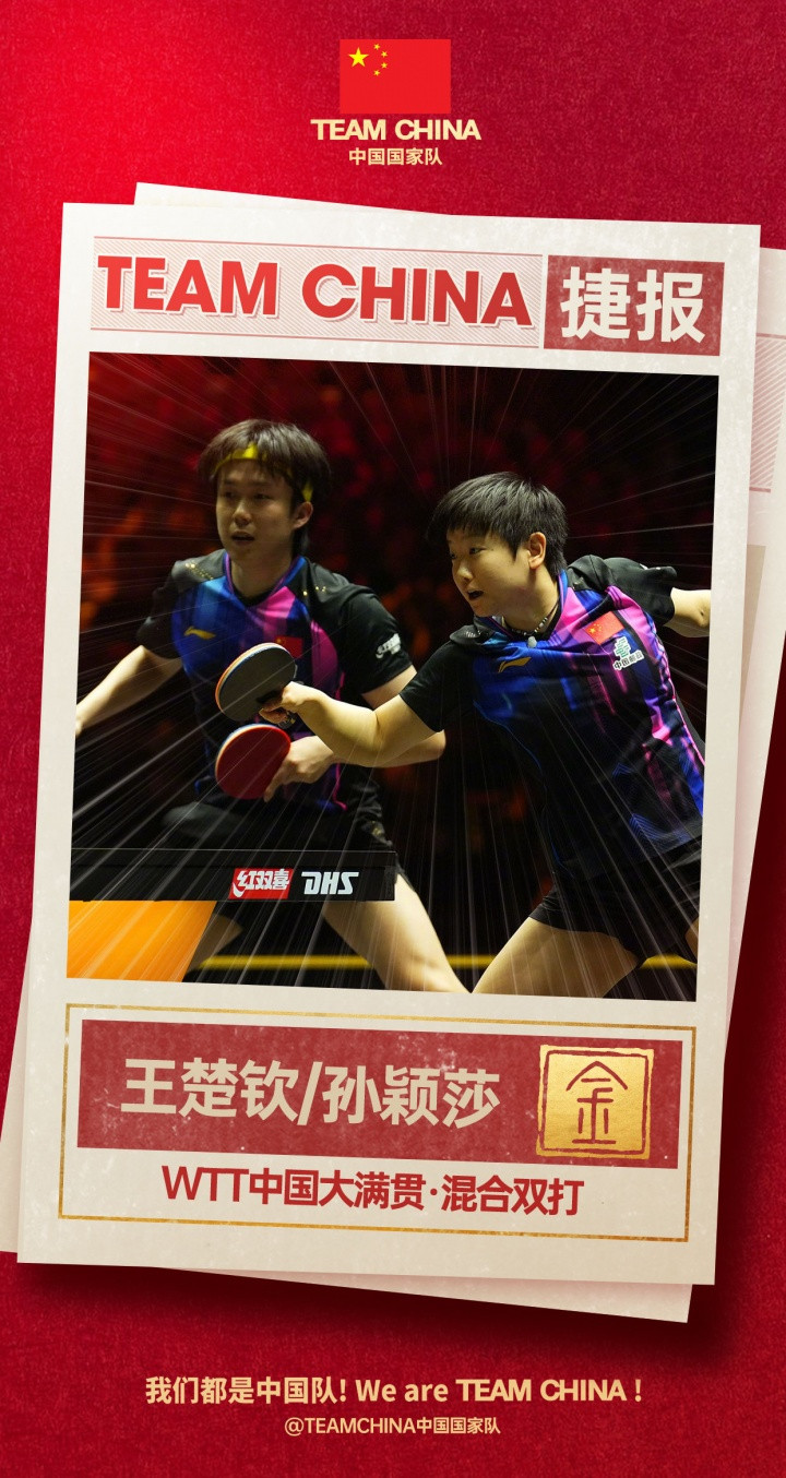 直播吧10月03日讯 WTT中国大满贯混双决赛,王楚钦/孙颖莎组合3-0击败黄友政/陈熠组合,夺得混双冠军。